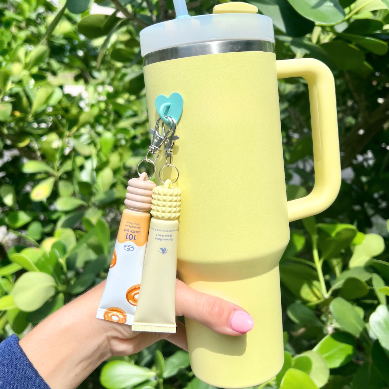 Peel off the adhesive backing and press firmly onto a clean, dry surface. Let it set for 24 hours before attaching your gloss or keychain for the strongest hold.